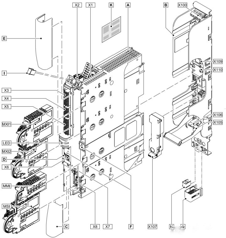 我們以單軸控制器、功率范圍0.37~11 kW的伺服驅(qū)動器為例,介紹下各部件的組成。先來看下實物圖和結(jié)構(gòu)圖: